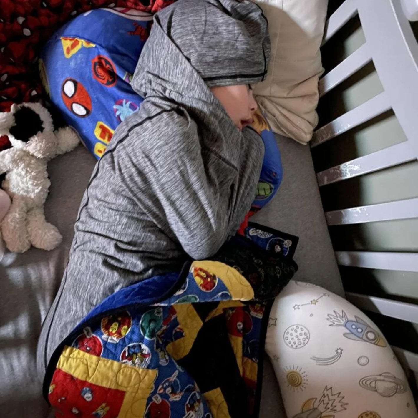 The ADHD Sleep Cocoon addresses the neurological root cause: proprioceptive dysfunction. ADHD brains don't know where their body ends and the world begins, creating constant sensory seeking that intensifies at bedtime. Our 360° compression provides the physical boundary their nervous system needs to finally calm down.